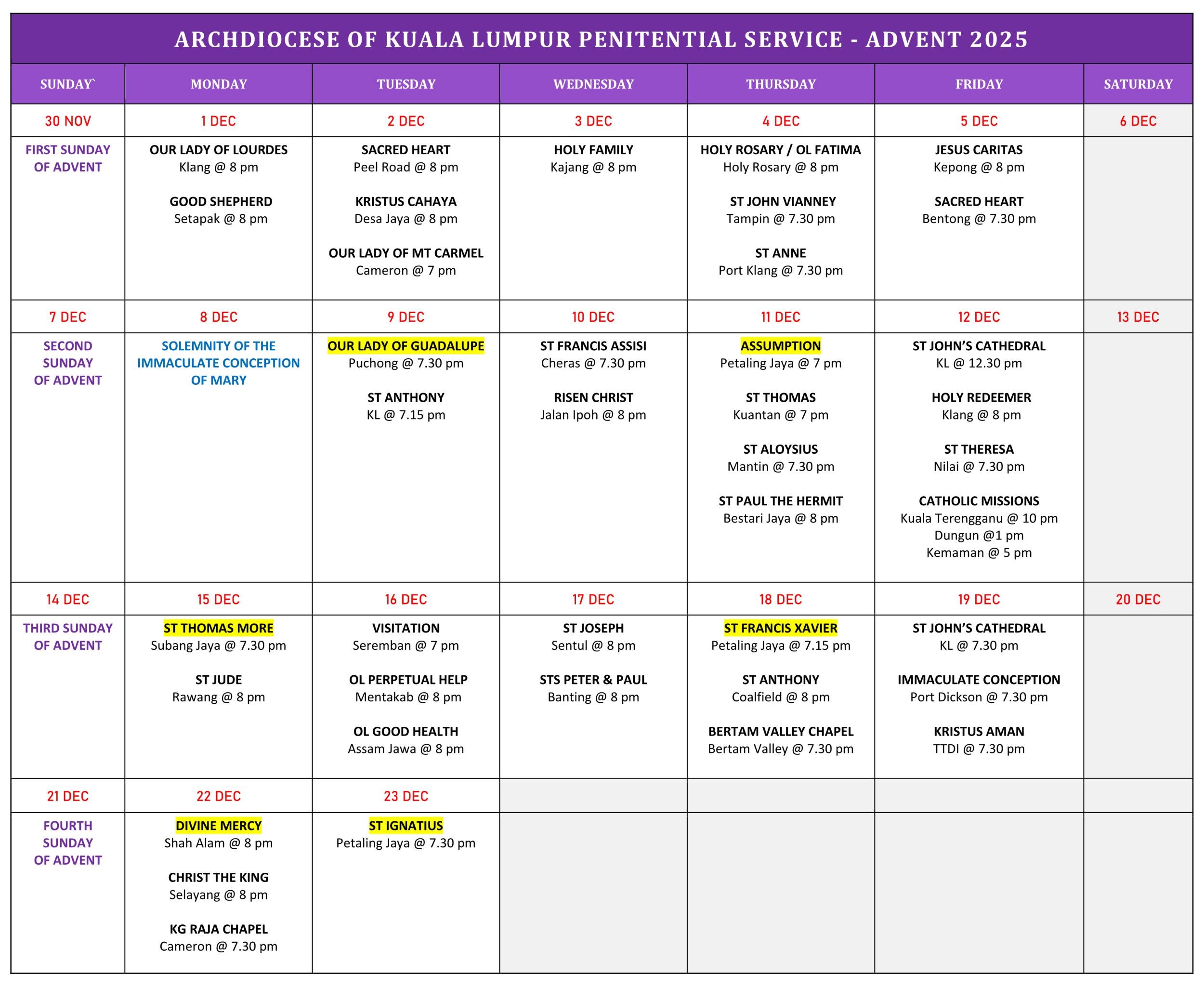 ArchKL Advent Penitential Service Schedule Oct 22, 2025 Download the pdf file from ArchKL for your reference.