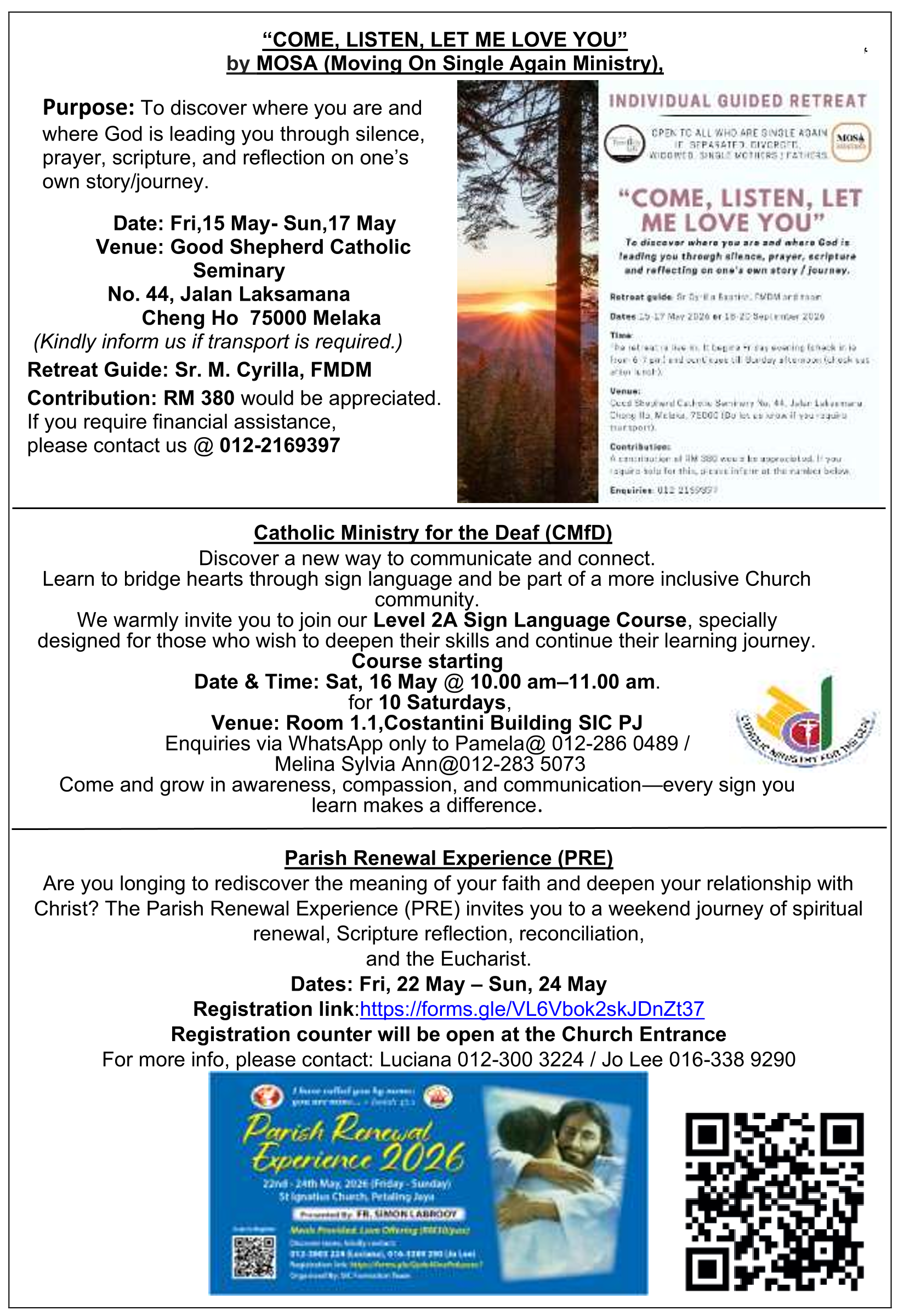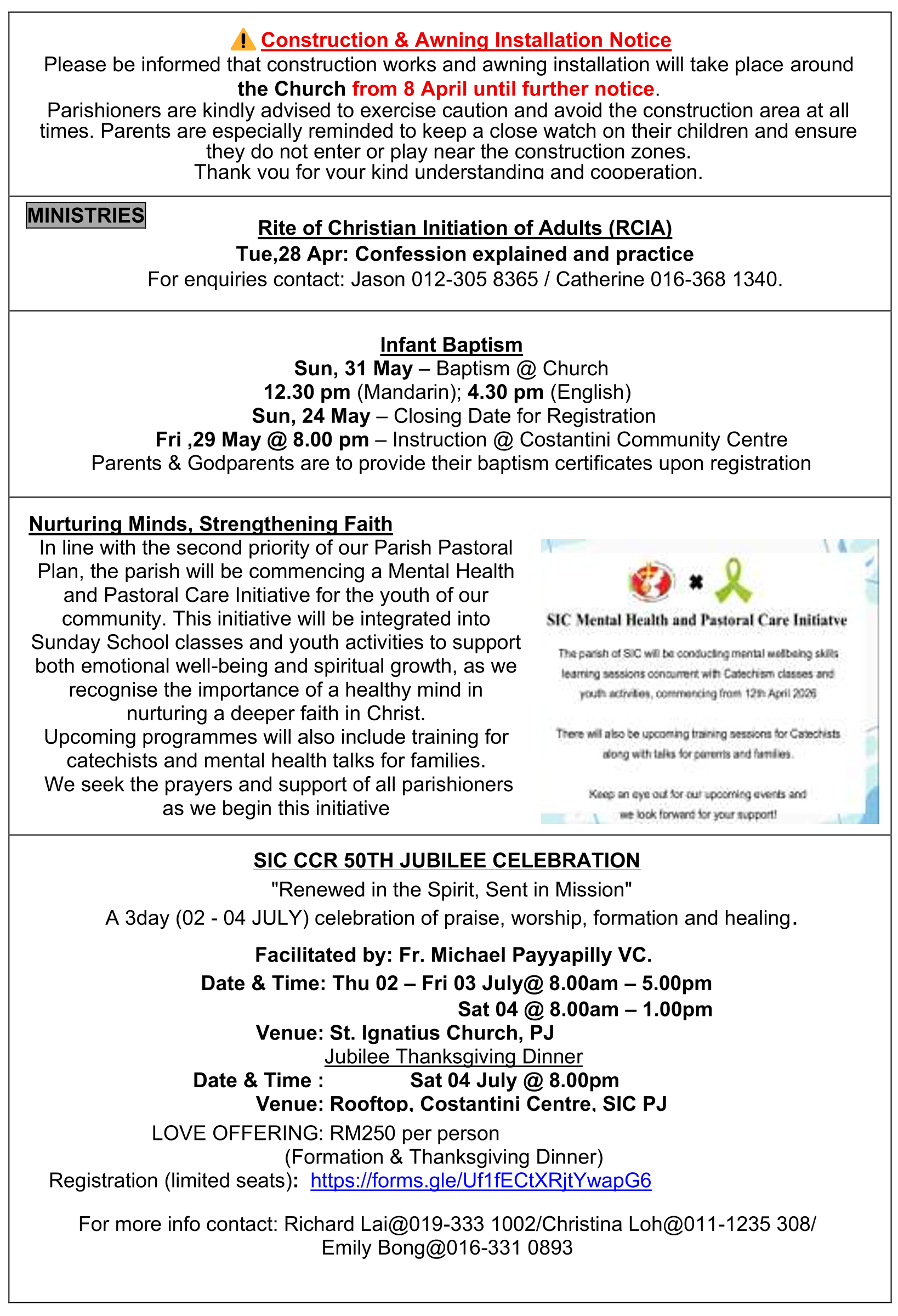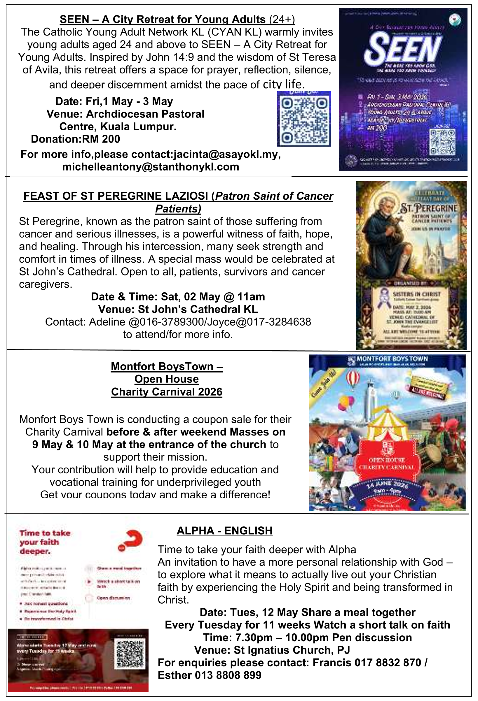 Download the latest SIC Bulletin, Mass Intentions, Mass Intentions (offered via SIC website) & NewBEC (English, Mandarin, Bahasa Malaysia & Tamil). Also available are the most recent past editions: