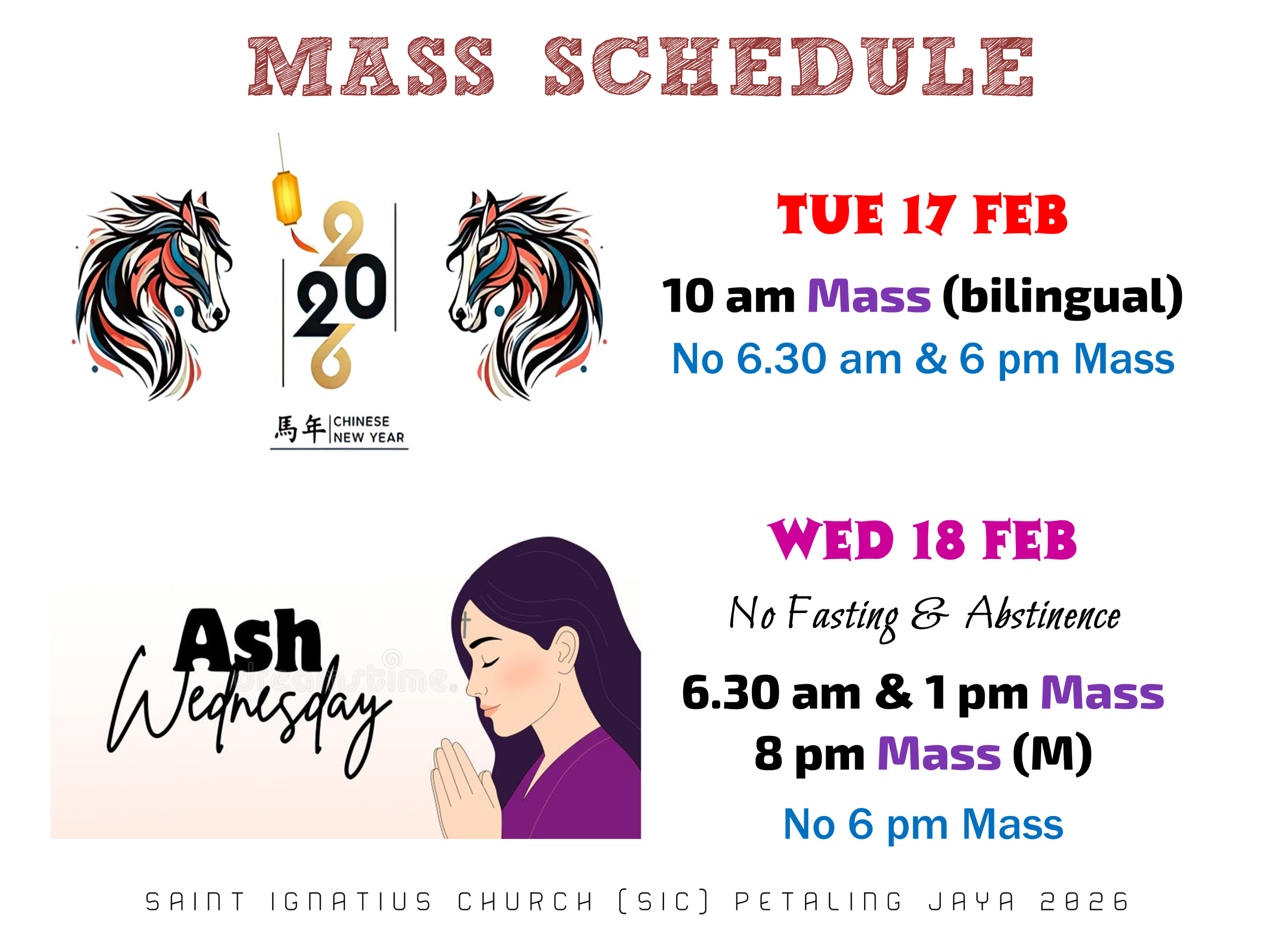 Mass Schedule – Tue 17 & Wed 18 Feb