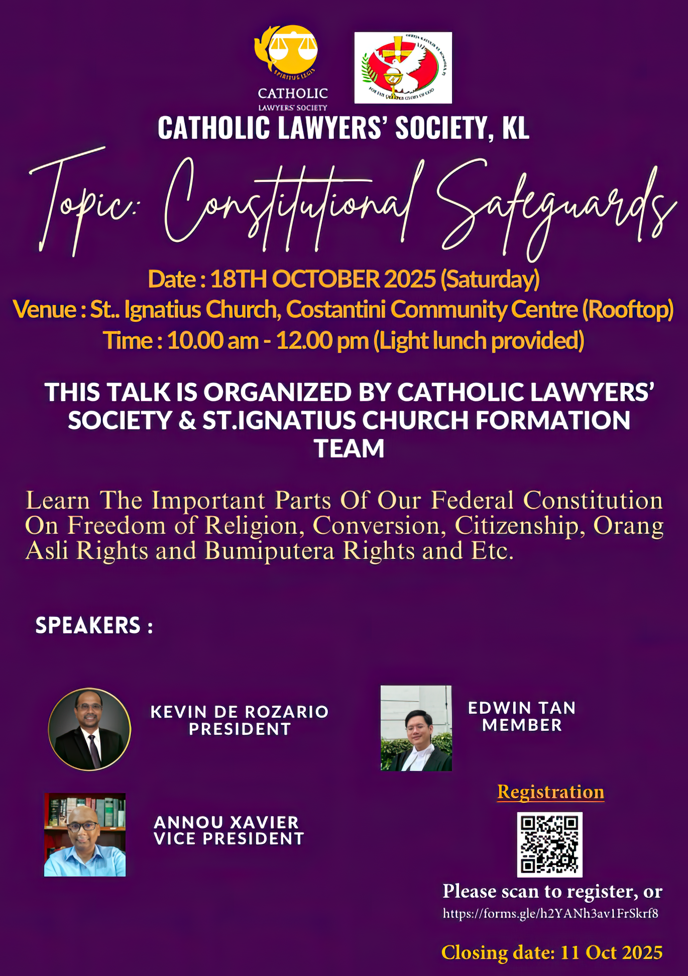 The Constitutional Safeguards talk on Saturday 18 October, jointly organised by Catholic Lawyers’ Society and SIC, is open for registration.